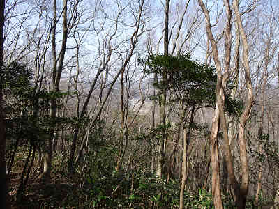 三角点を後にして明るい祠跡付近で小休止、この石組みがあるから笹がきれいに刈られていたのだろう。わずかに坂を下り周囲の展望を眺めるが、全てが樹間越しだった。