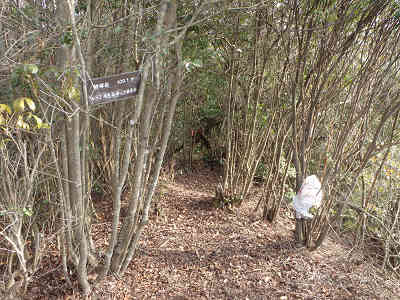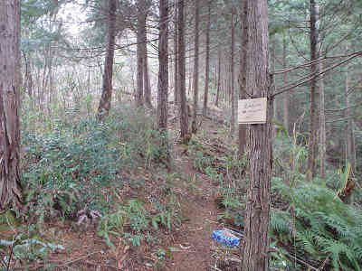 県道横にある登山口の案内に従い登山を開始。この案内は仁保自治会によるもので、山頂まで60分と案内されている。これだけ立派な案内が立っていると言うことは、山頂までしっかり目印があるものと確信し、地図も持たずに登山口を出発した。 車止めのある作業道に入ると、足下はコンクリート舗装の道である。そのまま道なりに進むと進路は左に向き、前方には堰堤が見えてくる。登山道は堰堤左側から続いており、檜の植林帯に入る。この入口付近に案内板が掛けられており、山頂まで50分と書かれている。 足下には金属製の箱が置かれ、この中には金光康資さんの「防長山野へのいざない」より蕎麦ヶ岳付近の地図のコピーが置かれていた。なお、このコースは同シリーズの第4集に記載されているのだが、それは帰宅して判明したことである。