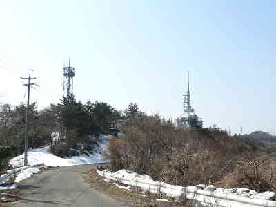 澄水山の山頂 いろいろな種類のアンテナを眺めながら快適に舗装路を進んでいると、やがて澄水山へ500m、枕木山へ4.4km標識を通過、そのまま進むと工事中の場所に大平山へ2.8km、枕木山駐車場へ3.8kmの案内が立っていた。いったい枕木山駐車場はどこだったのだろう。