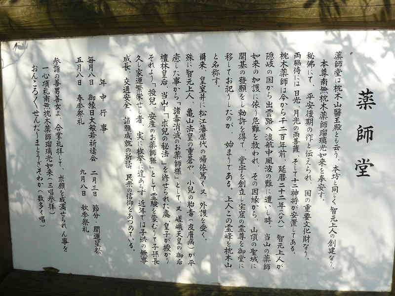 目の前には立派な薬師堂が建っており、沢山のお願いをする。案内によれば、この薬師堂は、諸毒消滅のお薬師様・求兒、安産のお薬師様としても霊験有るお薬師様とのこと。また、薬師堂に安置されている薬師如来は、国の重要文化財の指定を受けている。