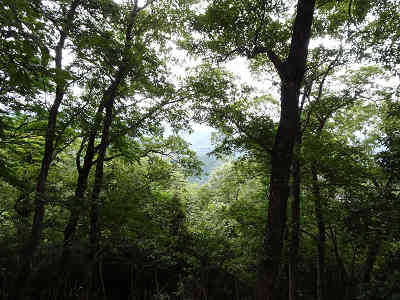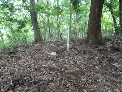 この游界上人の墓の後に四等三角点が置かれているので確認し、わずかに坂を登れば丸瀬山の山頂に着いた。山頂は広く平坦で中央部がわずかに高く盛り上がっていた。周囲に樹林の背が高く、展望は樹間越しだった。晴れていた空が少し暗くなったので雨の予感、急いで元来た道を引き返した。