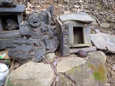 素焼きの駒犬、駒犬に乗った神様も祀られ、信仰の象徴のような気がした。正月4日にこの場所でお餅を食べる習慣があるそうで、周防大島には嵩山の登山口にある岩屋権現と同じように、お正月に餅を焼いて食べる風習があるのだろう。