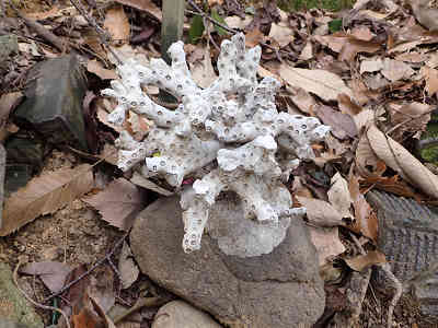 この先から高度を下げると足下にギンリョウソウを見つけ、更に下ると2番目の「中の若山」へ着いた。標高は85mの中の若山には祠が3基祀られ、ニホンアワサンゴ、駒犬、木槌の石板、祠の上部、祠の壊れた残骸などが置かれていた。
