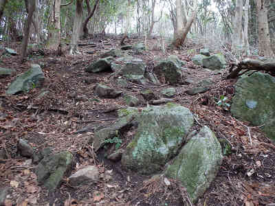 間もなく周囲に大岩が目立ってくると、最初の休憩地へ到着。腰掛けるのに丁度良い岩がこのあたりには多い。少しの傾斜の道を更に進み、自然林と植林帯の混在する道を辿る。岩の多い場所を過ごし、平坦な場所を過ごせは山頂へ向かう最後の急登が待っている。