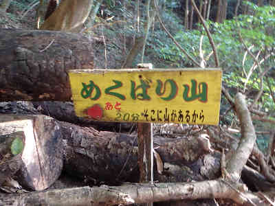 正面に見えている墓地へ向かい、墓地の手前を右折する。右に果樹園跡を眺めながらわずかに進むと登山道は左へ向き、頭上には樹林の勢いが強いため、登山道入口がトンネル状になっている。なお、この手前には目配山登山歩道などの案内が置かれているので目印となる。 明るい場所から日陰の中に入るので暗い感じがするものの、目が慣れれば良く踏まれた道なので安心である。植林帯の下を辿るが、入口付近には倒木の跡があり、歩きにくい場所はしっかり伐採されているので歩行に支障はない。