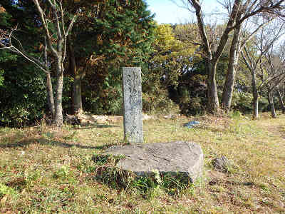 再び樹林の茂る中に入ると、右に道が分岐していた。そのまま道なりに進むと、足下には巡視路特有のプラスチック階段が現れた。本登山中初めて負荷のかかる坂を登れば、わずかで青空の下、多くの桜が植栽された広い草原へ飛び出た。 広い山頂尾根の中央部へ出たので左方向へ進むと、大きな平岩の横に石柱が置かれていた。石柱には神功皇后の故事の石のような文字が掘られているが、上手すぎて読むことができなかった。