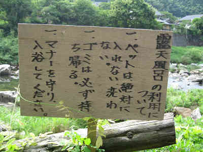 温泉街の奥にある駐車場へ車を入れ、斐伊川を見下ろすとすぐに露天風呂が見えてくる。入口の注意書きを読み、坂を下ればすぐに露天風呂へ到着。大きな岩の上で服を脱ぎ、温泉へ浸かる。温度は真夏なので少々熱めだが、とても気持ちの良い温泉である。泉質は単純アルカリ泉、ヌルヌル感がとても良い。足下からプクプク泡が浮かび、源泉かけ流しの温泉である。