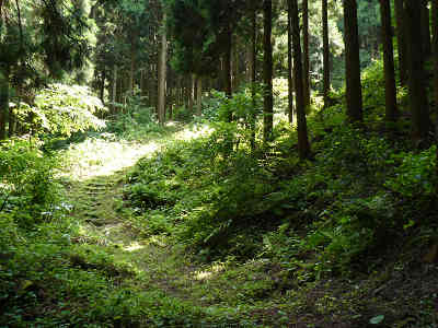 木漏れ日の美しい登山口を出発、最初は左に沢を見ながら進むが、この清流はとても美しい。すぐに橋を渡り、植林帯の中につけられた遊歩道に入る。左に大きな岩が二つ配置され、この自然の景観と人工的な植林の配置が良い雰囲気を醸し出している。