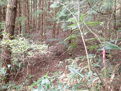 前方を見ると目印のピンクテープが続いており、足下を確認しながら慎重に進む。植林帯を少し進むと左右に大岩を見る。ここで少し高度を上げると足下に岩が転がっていた。笹を分けながら高度を上げれば、足下に林業公社の杭を過ごす。進路は西へ向き、山腹につけられた道を進むのだが足下は狭く、しかも笹が茂っているので笹を分けながら進む。
