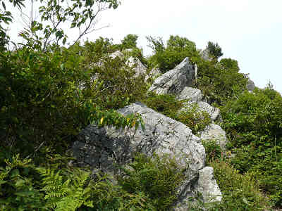 山道を登って行き、尾根道に入ると最後に岩場がありこれをよじ登る。山に登っているんだという感じがして楽しくなる。この岩場を越えるとすぐに三ヶ嶽西岳に到着である。山頂からの景色は霧のためすこぶる悪い。中岳から東岳と移動するが一向に霧が晴れない。霧の中を歩いているようだ。展望が期待できないのですぐに下山を始める。