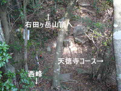 本日の豪華昼食は、コンビニのおむすび。展望は少し霞み気味だが、晴れているので気持ちよい。食事を済ませ、午後1時40分過ぎに下山を開始。西峰との鞍部まで下り、分岐を左折して天徳寺を目指す。この天徳寺コースは一番の人気のコースなのだろう、午後の遅い時間にも拘わらず、途中で多くの方と出会う。