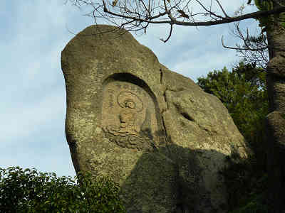 この上のピークが岩船山(194m)で北に右田ヶ岳、南に防府市街の展望を見晴らす展望地となっている。矢筈ヶ岳と大平山を眺めて更に下山を続ける。すぐに般若心経の刻まれた岩を過ごし、岩に描かれた観音像を眺めながら滑り易い道を下る。