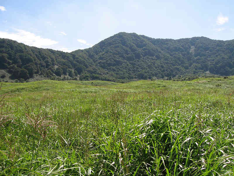 木漏れ日が美しい樹林 暫く続いた平坦路は少しずつ傾斜を増し、徐々に高度を上げ始める。目の前には背丈ほどの笹の道が現れ、笹をかき分けるように高度を上げれば、笹の道はススキの道へと変化した。突然、それこそ突然目の前が開け、ススキの平原が現れた。これが三原台、素晴らしい展望にびっくりした。