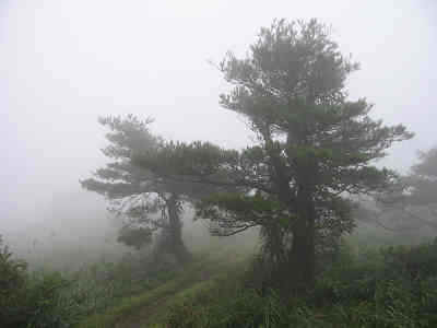 霧の中の広い山頂 山頂にて記念撮影をしていると雨が落ちてきたので下山を開始することにした。山頂から急な坂道を滑らないように慎重に下りていると、沢山の登山者とすれ違う。人数を数えてみるとこのグループは16人、凄い人数だ。更に下りていると霧の中の美しい松の場所を通過、やはり霧の中の松の風景は素晴らしい。美しい松をじっくりと眺めた後、更に下山を続ける。