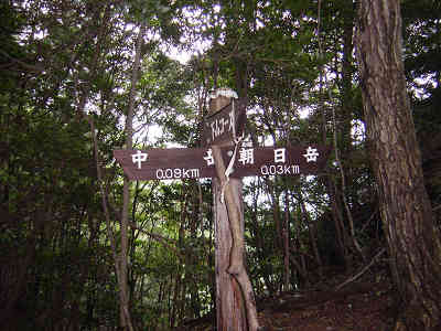 もう中岳・朝日岳別れまでは0.1km、更に石段を登れば八合目の標識を過ごし、中岳・朝日岳別れに到着した。ここから朝日岳までは30m、中岳までは90mと案内されている。まずは右の朝日岳へ向かう。岩の間には木の根が露出しており、丁度良い手がかりとなる。四つんばいになって登って行くと目の前に大岩の目立つ朝日岳へ到着した。少し岩を下りると眼下に展望の広がる場所に着く。