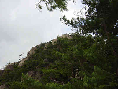 もう少し進めば中岳・朝日岳別れまで残り0.3km、急な階段を登ればもう七合目を過ぎる。この先で正面に立ちはだかるような大岩が現れたので真下から眺め、この大岩を右に過ごす。この先では前方及び左右を大きな岩に囲まれ、一体進行方向は何処なのか・・・?と悩むが、足下に続く階段を目で追えば、左方向に進路を見つけることが出来る。この岩の間につけられた道が凄く良い。