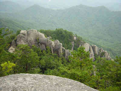 スズメバチの巣発見 双眼鏡で観察するとちゃんとスズメバチが巣の中を出たり入ったりしている。さあ、困った。思案の末、ウインドブレーカーに身を包み、顔はタオルで覆面状態。何とも不格好だが背を低くして急いで巣の下を通過した。少し進んで背後を振り返れば無事に通り過ぎたことに一安心。と、この岩は登ることが出来るようだ。背後から静かに岩を登り、岩の上に立った。岩の上からは先程まで居た灯籠岩が一望、岩峰の右には大野権現山が続き、やはり美しい展望を眺めることが出来た。