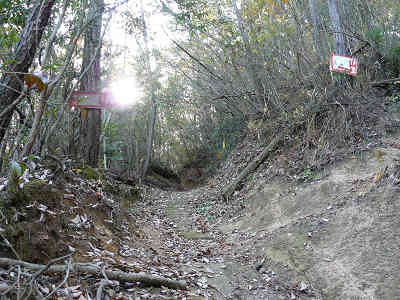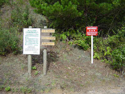 周囲を覆っていた樹林が少なくなり、足下が広くなったので、頭上を見上げれば高圧電線が走っていた。もう少し下りて行けば広い道に突き当たり、入口には瓦小屋山の案内が立ててあった。この道は中国電力の鉄塔の巡視路のようだ。巡視路を左折し広い道を下りて行く。快適なる巡視路は途中から細いコンクリート舗装の道に変わり、右に墓地を過ごす。