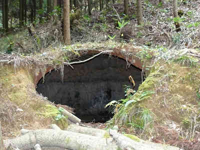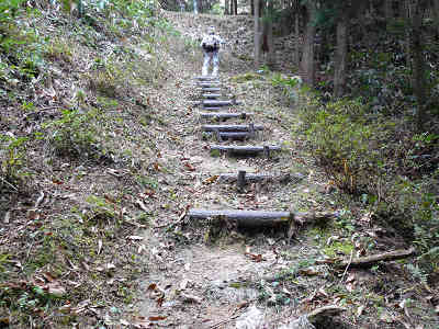 入口を出発、偽木の階段を進むと最初に現れるのが大手門石垣、とても立派な石垣にまず圧倒された。機械も何もなかった時代に、こんな大きな岩を組む技術を確立していたことは、新鮮な驚きである。次に現れるのは平坦な二の丸で、周囲は植林帯になっている。 右に大きな倉庫のような穴を過ごし、再び偽木の階段を登る。このあたりは直線となっており、城を守る側にとっては、相手方が一列縦隊となるので攻めやすくなっている。この先で迷路石垣を折り返し、次の分岐が七曲りである。
