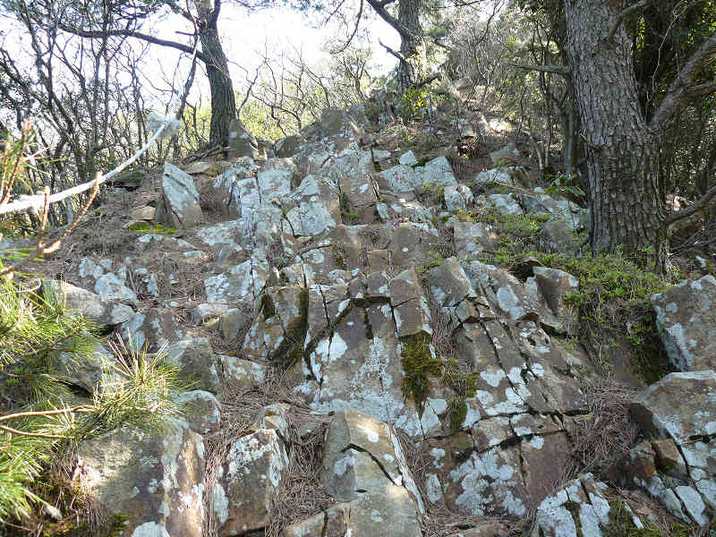 足下の落ち葉により滑り易くなると、ロープの補助が現れ、とても助かる。周囲に特徴的な岩が目立ち始めると同時に、坂の傾斜がきつくなり、ワイルドな岩道がとても嬉しい。ここにもロープが渡してあり、面白いように高度を上げることが出来る。周囲に松が目立ち、白い岩と青い松の配置が美しく、まるで日本庭園のような素晴らしい景色が続いている。
