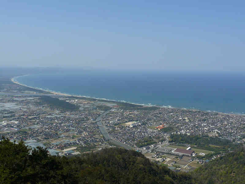 南方面を振り返れば、遠くに大きな山容が霞んでいるが、これは三瓶山。その右には大江高山火山群もうっすら見えている。青い海とのコントラストが素晴らしく、最初から感動的な風景に出会っている。眼下に出雲大社を見下ろしながらの弥山登山は、周囲にとても気持ちの良い風景が広がっている。