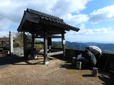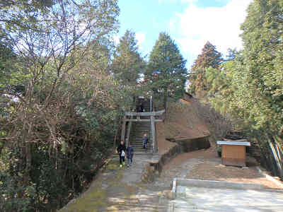 間もなく左に十九丁を見て、明るい道を進むと石段の前に到着、見上げればもう弥山社は目の前だ。急な石段に取り付くと空が青い。すぐに弥山社へ参拝、さすがにお正月で参拝者の多いことにびっくり。こんなに参拝者の多いことは初めてかも知れない。