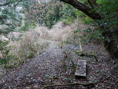 そのまま道なりに進んでいると少しずつ高度が上がり、鋪装道の終点に着いた。この先に架かるコンクリートの橋を渡り、引き続き中国自然歩道を進む。道は広く歩きやすく整備されているので歩くのに何も問題は無い。足下に古びた擬木階段を踏みしめながら進む。