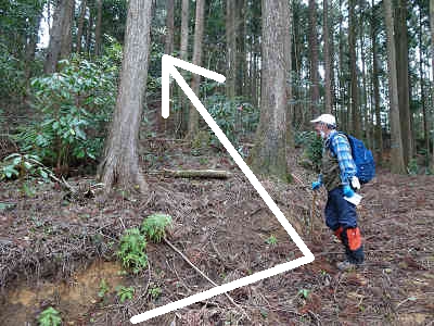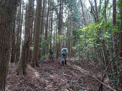 樹林が無ければ眼下に展望が広がり、敵を発見するのはたやすいことだったろうが、現在では周囲を樹林に覆われて展望は望めない。これで目的の山は全て踏んだので下山を開始する。先ほどの分岐まで引き返し南へ下る。途中で快適な遊歩道とは言えない状況になるが、すぐに林道五味ヶ原線に下り立った。この林道は先ほどの伐採地に続いているのかも知れない。