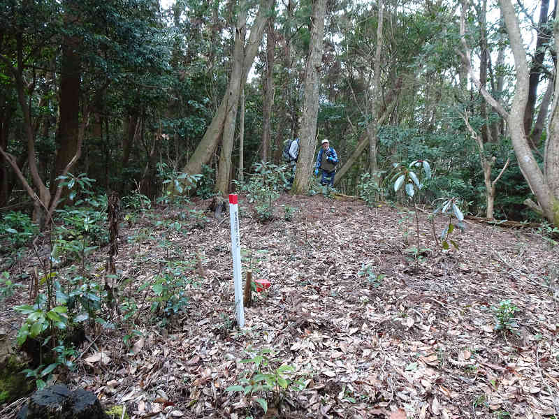 昼食後に416mを出発、一旦東へ進みすぐに南へ下る。下った先が勝陣峠で二体の石仏が置かれていた。やはり廃仏毀釈の影響で首が落とされていた。峠から坂に取り付きイノシシのヌタ場を過ごし、岩の目立つ場所を越えれば、「朝か峠山」の山頂に着いた。山頂と言っても何も標識が無いのでマジックで木に書いておいた。当然ながら周囲の樹林の背が高く展望は無い。