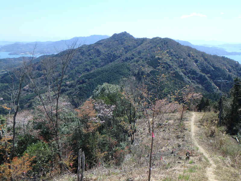 山頂からは南面に広がる瀬戸内海はもとより、背後には蓮華山や物見ヶ岳、遠く金峰山なども見晴らすことができました。中岳を経て東岳へ移動し、桜を観賞。次は琴石山へ向かいます。