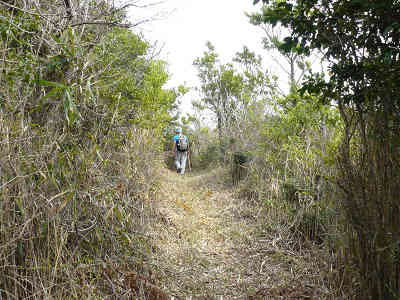 さて、少し下った鞍部で、尾根道との分岐に出るが、右の尾根道は荒れているので左の道を採る。この付近はしばらく平坦な道が続くので、とても快適である。やがていかにもヤセ尾根という場所に着けば、左に分岐が現れるので左折する。なお、直進方向への道はしっかりしているように見えるが、間もなく消失し、踏み跡もなくなるので十分注意すること。