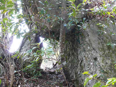 割石コース入口 再び林道を横切り、うっそうとした竹林帯の下を進む。岩の割れた場所を進み、少しずつ坂の傾斜が増してくる。尾根に着いたかと思えば、進路は左に変わり、植林帯の下につけられた道を進む。