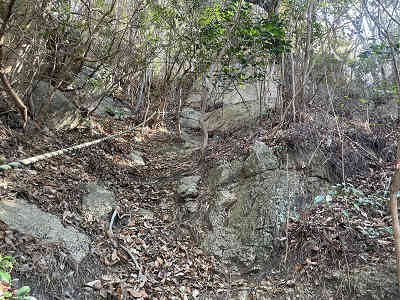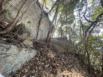 滑りやすい急傾斜を登り切り、岩の間を進むと少し高度が下がる。ここで右下を見ると城山の石垣が残っている。貴重な石垣を眺め、そのまま明るい展望地に着くが、この展望地から眺める竜ヶ岳は樹間越しとなっている。