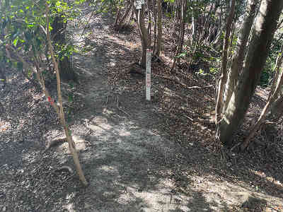 畑の手前の広い場所に駐車し、東へ続く坂を登り、左に6地蔵を眺めて北へ続く登山道に入る。この起点にも城山の案内が置かれている。広い登山道を進み、左に作業小屋を過ごし、沢を渡れば周囲に植林が増える。