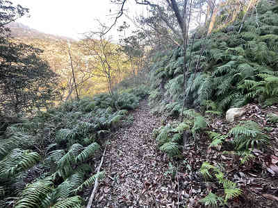 道なりにもう少し進むと登山道は左上へ続き、少し登れば進路は右(北)へ向く。少しずつ高度を上げると周囲にシダが目立ち始める。ただし、しっかりシダは刈られているため歩くのに支障は無い。道の左右にシダを眺めながら北へ向かって直登する。