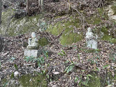今から4年前、2020年の七夕豪雨では三丘地区で家屋が浸水する被害が起きているが、この道は被害も無かったようだ。やがて右側に16番の石仏を過ごす。更に進むと土石流の跡を通過するが、淡海道に被害は無かった。進行方向に山陽自動車道の高架を樹間越しに眺める場所へ着くと、15番の石仏の祀られた場所を通過する。