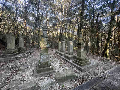 更に下ると右に毛利元政宝篋印塔、宍戸家墓所、宍戸家家老末兼家墓所の案内があり、向かって見る。すぐに宍戸家仙竜寺墓所に着き、三丘領主となった宍戸家初代から四代の墓所、末兼家墓所を見学、更に奥へ進み毛利元政宝篋印塔、宍戸元続婦人の墓を見学した。ここで少し引き返して島田川へ向かって南へ進むと毛利公関連の案内の置かれた筏場橋の手前に着いた。