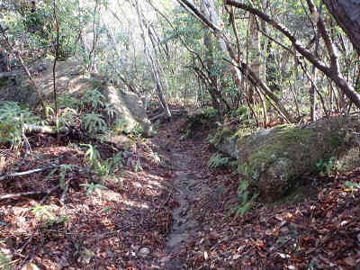 さて、階段を登れば、自然林の下に登山道が続いている。左右に大岩が目立ち、足下には落ち葉が堆積して滑り易い。足下に注意を払い、緩やかな傾斜の坂を進む。左右にシダの茂る場所もあるが、歩行には全く支障が無い。
