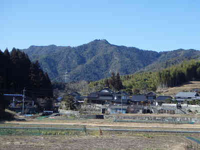 西には先程まで立っていた大師山がその岩峰を豪快に見せている。兎岩からの展望を眺めた後、更に高度を下げる。その途中、大きな天狗岩の上からも前方に白滝山、背後に大師山の展望を眺める。 滑り易い土質の道を慎重に下り、白滝山グランドから続く登山道との合流点へ着く。白滝山への案内に従い、少し坂を登れば見晴らし岩へ着く。眼下には出発地の集会所、その先に集落が続いており、南には白滝山が大きくそびえている。背後に大師山を確認して更に先へ進む。