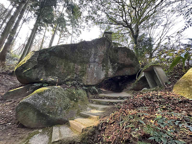 祠の手前には通夜堂跡が残っており、参拝者が日の出を待つために使用していたと説明されている。祠に参拝後、南へ続く登山道を辿り、坂を下れば大きなタンク横から鋪装道に出る。大星山への登山道は鋪装道を横切る先が続いており、真っ直ぐな急登に取り付く。