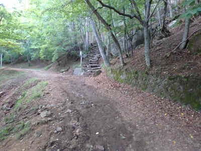 間もなく里宮さんへの参道が左に分岐し、もう少し高度を上げるとベンチの置かれた丁字路へ出た。ここで進路を右へ採り、樹林の下につけられた道を進む。左に林道の案内を見るが、この林道は先程横切った道と思われる。