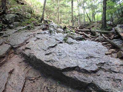 この沢を渡り、少し進むと丸い岩に亀裂の入った桃太郎岩が現れた。桃太郎岩の右につけられた階段を登り、この先からは岩の多い地点をロープの補助などにより高度を上げる。岩が濡れているのでとても滑り易く慎重に登る。