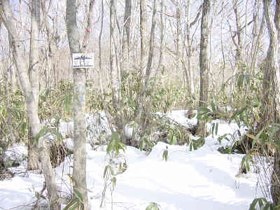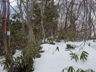 分岐を左に向かい下山を開始した。すぐに先程落とした鎌を見つけた。リュックに鎌を仕舞って降りて行く。雪山の下山で楽なところは、踏み跡をそのまま降りて行けば道を間違えることはないということで、目印のテープを探す手間が無く意外と早く降りることができた。