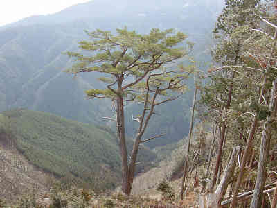 下山開始から30分で雪が完全になくなり展望地まで戻った。展望地から先は急な坂の下りで滑らないよう注意しながら降りて行った。展望地を少し降りた絶壁のような場所に大きな松が立っているのが印象的である。林道を経由し伐採地を抜け藪道をどんどん進んで下山する。きれいな檜林を抜けて行き、少し安心した。