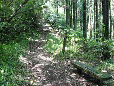 この先で再び坂を下ると、先ほど案内のあった土塁を眺める事ができる。人力でこれだけの土塁を作るのは大変なことだろう。峠に出れば嘉納山まで1.2km、木漏れ日指す道を進んでいると、気持ちの良い真っ直ぐな道に出る。この地点は毎回感動する場所であり、丁度文珠山と嘉納山の中間点付近である。
