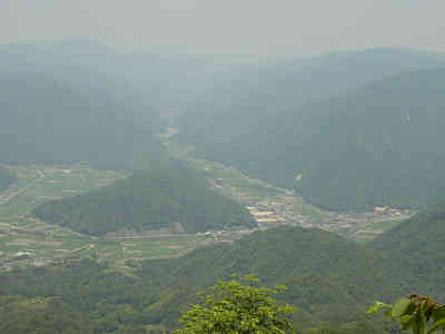 山頂からの展望、真田地区が眼下に広がる 帰りは急坂を楽しむため笹藪の急斜面の坂をゆっくりと降りていった。写真で急斜面を表現しようとするが立体的な写真とならず、傾斜を写真で表現することは難しいと言うことだけがわかった。