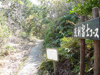 特徴ある形の八角棟を左に、右に少年自然の家を見ながら舗装された坂を登れば、「冒険の森コース」の案内板が建つ場所へ着く。この右手にも高仙地蔵道の案内があり、そのまま進むと「浅利富士コース」の案内が立っていた。県外から来た私は、この標識のおかげで登山口を確認、ようやく安心することができた。