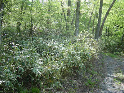 下山時にこの道を通り過ぎないように目印を分岐点に置いて尾根道を登る。緩やかだった坂道が段々急になり、歩みものろくなる。少し進んでは大休止を繰り返しながら高度を稼ぐことになった。尾根道に入って丁度10分ですこし平らな尾根道となり、緩やかな下り道に入る。ここから大将山の山頂方向を木の間越しにかいま見ることができた。再び急な坂を登ることになるが、この付近からは特に青葉が綺麗で、緑のシャワーの中に入って行くようでとても気持ちがよい。