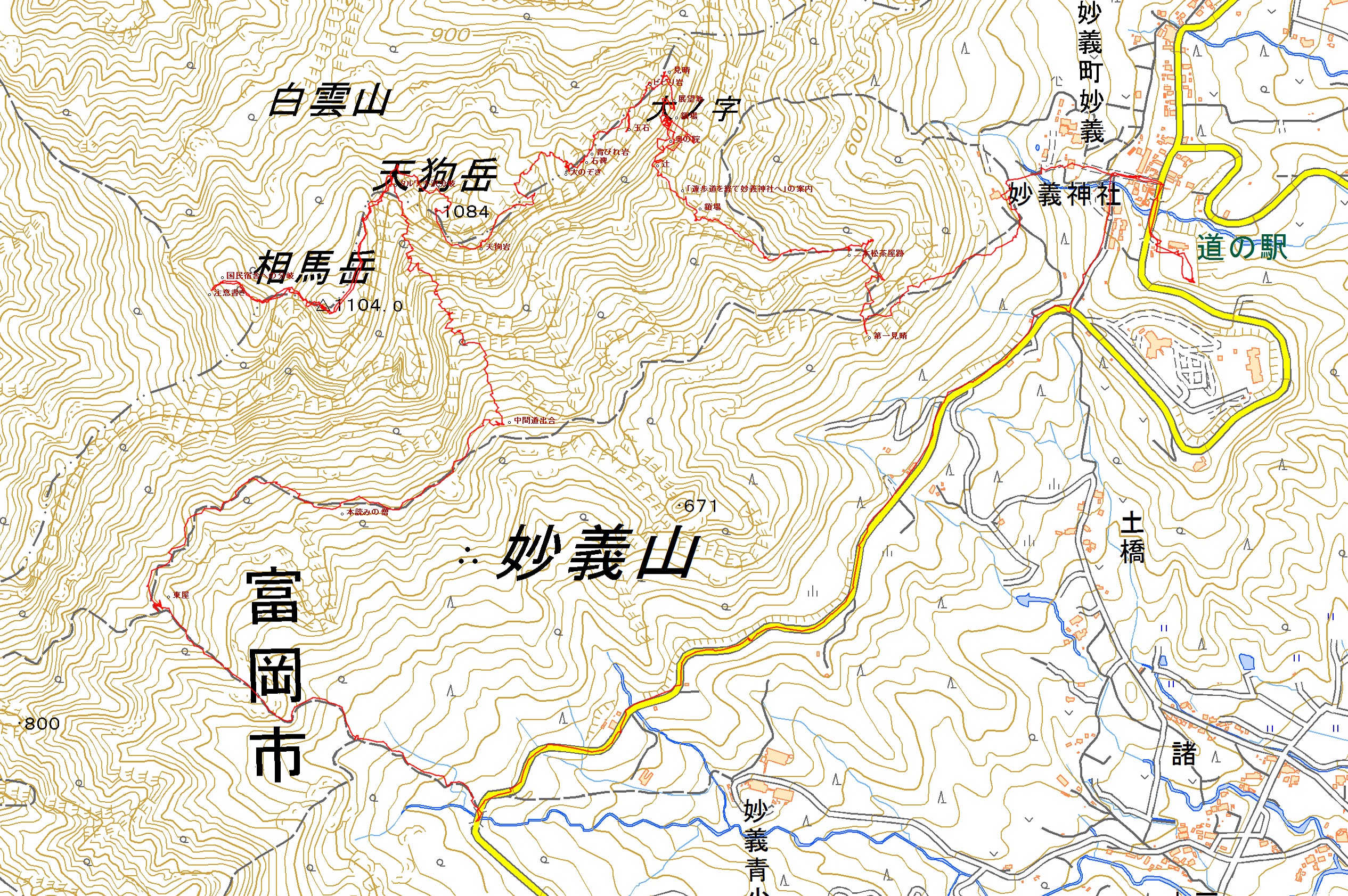 緑の樹林の下を辿れば、間もなく大人場と案内される場所へ着き、更に進むと屋根のある休憩所を過ごす。登山道を道なりに下ると熊出没注意の看板の先でゥ戸川に架かる金鶏橋の側の車道へ到着。車道を左折して道なりに進み、登山口の妙義神社前へ着いた。なんとも長い周回登山であった。午前6時過ぎに妙義神社前を出発し、帰り着いたのは14時過ぎ、約8時間程度歩き回っていたことになる。