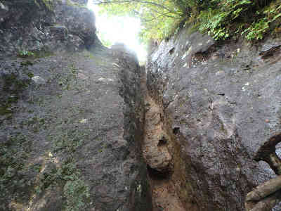大のぞきから鎖を補助に一気に高度を下げる。まず7〜8m下れば途中で鎖が左側に分岐し、更に7〜8m下ると最後の難所、約30m程度の滑り台状の岩場を下って地面に降り立った。この岩場の最後の所は濡れており、逆に登り返そうとすると、最初の2m程度がどうしても滑って登れない。この地点で、私の腕の力ではもう妙義神社方面へ引き返すことはできず、前進あるのみと言う選択肢しか無くなった。そんな気持ちで鎖の上をしばらく眺めた。